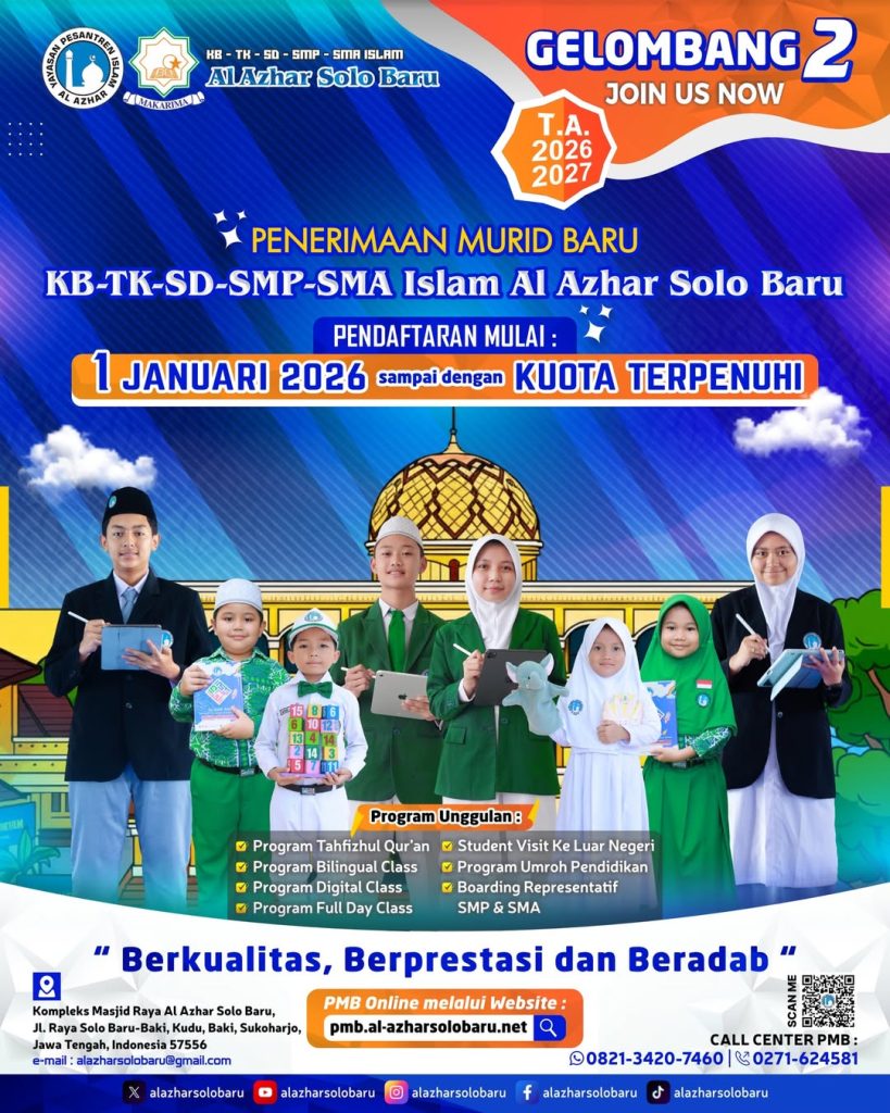 🌟 Jadilah bagian dari langkah awal membentuk Penerus Generasi Emas yang Berkualitas, Berprestasi, dan Beradab bersama KB-TK-SD-SMP-SMA Islam Al Azhar Solo Baru.